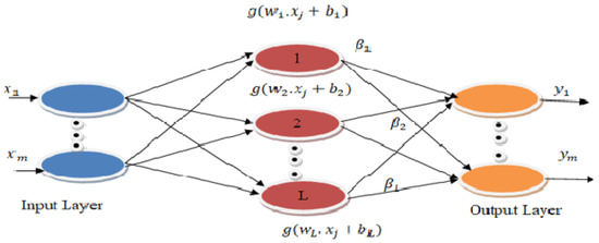 where x and y are input and output vectors, respectively; is a bias of hidden neurons; the weight vector between input and hidden layer is represented by ; and m and L denote the number of the training sample and hidden nodes, respectively. represents the output vector of the jth input vector. The output weight matrix joins ith hidden nodes with output neurons and is an activation function.