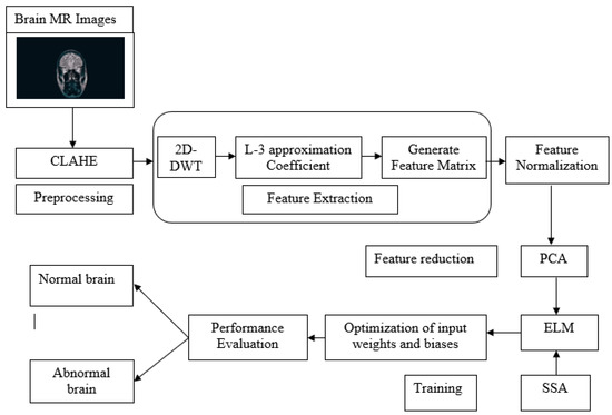 The overall scheme of the proposed hybrid technique (ELM-SSA) for the classification of brain MRI is shown in Figure 4.