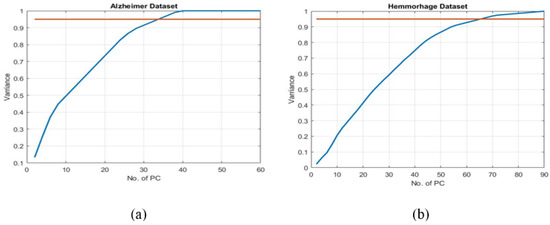In this study, two standard MR image datasets, i.e., Alzheimer’s and Hemorrhage, having 100 and 200 images, respectively, have been used. Each image on the two data sets has a resolution of . The Kaggle website is the source of images which are of two categories, i.e., normal brain images and abnormal brain images. Table 1 provides the details of the datasets. Each of the dataset contains 1296 number of features and two class labels.