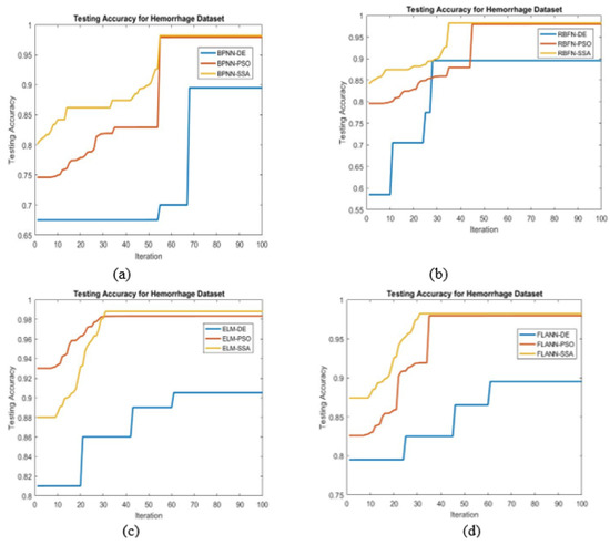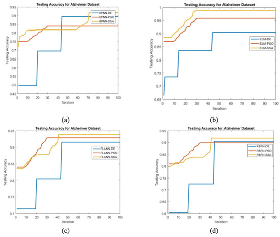 - In general, the proposed ELM-SSA model outperforms other hybridized classification models such as FLANN-SSA with an improvement in accuracy of and for Alzheimer’s and Hemorrhage datasets respectively. Similarly the ELM-SSA model has produced and better accuracy as compared to RBFN-SSA for two datasets. ELM-SSA has also shown and higher accuracy for Alzheimer’s and Hemorrhage datasets, respectively, as compared to BPNN-SSA.