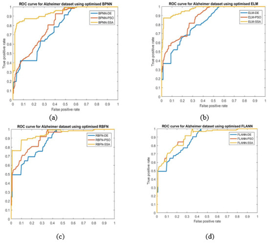 Comparison of ROC plots for Alzheimer’s dataset using classifier (a) BPNN, (b) ELM, (c) RBFN, or (d) FLANN.