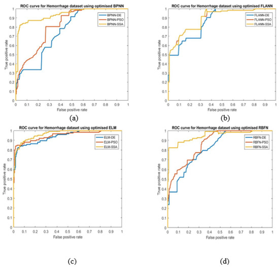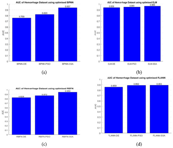 Comparison of AUC values for Hemorrhage dataset from models (a) BPNN, (b) ELM, (c) RBFN, or (d) FLANN.