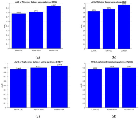 Comparison of AUC values for Alzheimer’s dataset obtained using models (a) BPNN, (b) ELM, (c) RBFN, or (d) FLANN.