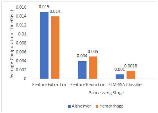 The computational time of each phase of proposed hybrid classifier (DWT + PCA + ELM-SSA) has been calculated for both the datasets. Figure 15 represents the comparison of the average time required for feature extraction, feature reduction, and classification over both the datasets in seconds (s) for a single brain image having a size of .