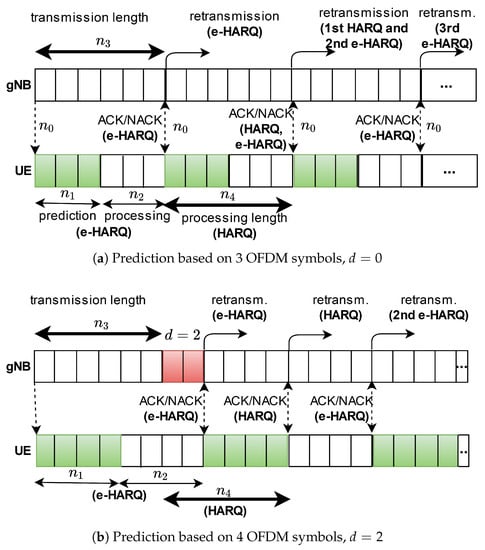 Here, we consider an example of a packet transmission length N equal to 6 OFDM symbols. Let us assume to be a number of propagation time units between the gNodeB (or gNB) and the UE, where a time unit aka microslot corresponds to the duration of an OFDM symbol. The e-HARQ scheme starts prediction process as soon as OFDM symbols are received at the UE and generates feedback respond in microslots. Consequently, the gNB will get it in time units from the beginning of the transmission, and then the first retransmission may start. To preserve the general terms, we suppose that actual transmission length is OFDM symbols with the corresponding processing of microslots. So the retransmission based on HARQ scheme can be performed in microslots, as shown in Figure 1.