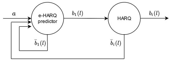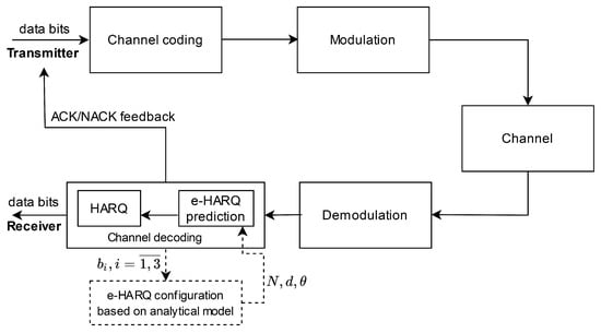 Figure 4 demonstrates a block diagram of a studied communication system on a high-level perspective, including e-HARQ prediction, HARQ and configuration of the e-HARQ prediction based on the proposed analytical model. As input parameters, the model gets the transition probabilities estimated from the e-HARQ prediction and HARQ mechanisms, and tunes the parameters of e-HARQ prediction by solving the optimization problem further described in Section 3. For the purpose of consistency, we have estimated the complexity of the model’s stationary distribution computation, which is of the order . The given complexity change corresponds to the worst-case scenario, when the analytical model together with e-HARQ is not able to reduce the amount of retransmissions based on the found optimal parameters. However, it has to be noted that e-HARQ configuration based on the proposed analytical model can be performed only once prior to the actual transmission, which obviously does not bring complexity changes to the actual transmission process demonstrated in the structure diagram above.