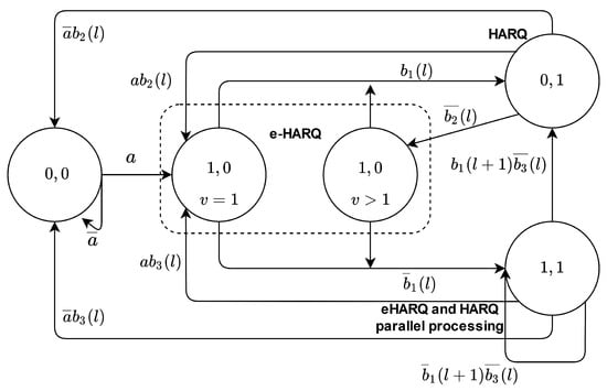 A packet arrives in the system with the probability . If the eFB, generated by the e-HARQ predictor at the first phase, is ACK, then the packet moves to the second phase with the probability , where l is a current number of deliveries of the given packet. Otherwise, when the eFB is NACK, the packet is to be retransmitted with the probability . However, the processing of the previous negatively acknowledged packet based on the e-HARQ predictor is still being done at the second phase with a deterministic probability equal to 1. By doing this, we achieve parallel operation of e-HARQ and HARQ, but keep priority on the HARQ decision in order to avoid unnecessary retransmissions generated by the e-HARQ misprediction. The found regular HARQ FeedBack (rFB) at the second phase allows terminating the delivery process in case of ACK with the probability or continuing the retransmission process in case of NACK with the probability . Here and further, with is an interval of natural numbers between a and b. We clarify the difference between and that can be expressed in terms of the feedback Random Variables (RVs) as,