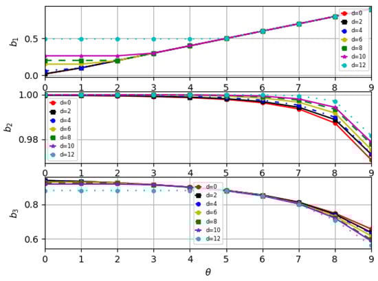and have been increased by a step size of for each l, respectively. Furthermore, the transition probabilities have been capped at 1. Therefore, resulting to for all l values at threshold .