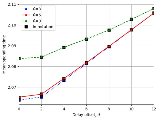 We start experimental analysis by verifying the accuracy of the proposed analytical model. Since the matrix of transition probabilities due to the big cardinality of the state space is quite complicated for clear verification, we have conducted an event-based imitation analysis, in which we have simulated multiple times the packet transmission flow through the states of the model until the probability distribution converges. The given imitation model allows obtaining the probability distribution along with the performance measures based on the collected statistical data. We utilize the transition probabilities demonstrated in Figure 5 and do not differentiate them in terms of l number of deliveries. The arrival rate is considered to be 0.2 for a transmission length of 14 OFDM symbols given the fact that modelling is done on a microslot level, which corresponds to the use cases that experience a transmission flow of packets. The mean spending time measured in time slots for a set of threshold values and all possible d for both analytical and imitation models is shown in Figure 6. The imitation of the given generalized model with a microslot processing is very computationally intensive and requires much more computational efforts until the system converges compared to the given analytical modelling, where the required performance measures are computed right away. Due to this, we have provided only a few experimental points for comparative analysis between two types of modelling; however, it is enough to verify the correctness of the matrix of transition probabilities.