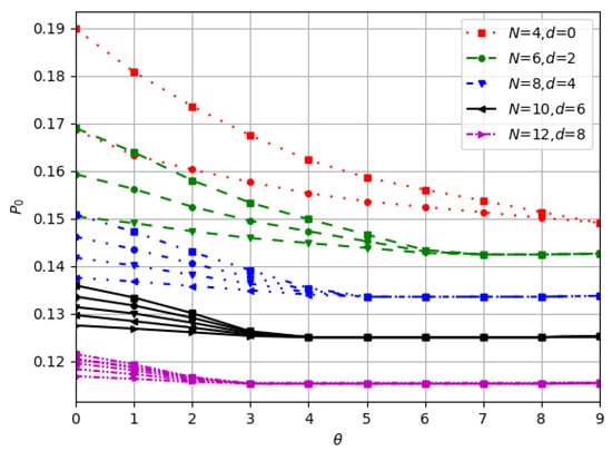 Probability of a system being idle for families of curves with two parameters: N (indicated by color), and d (indicated by marker).