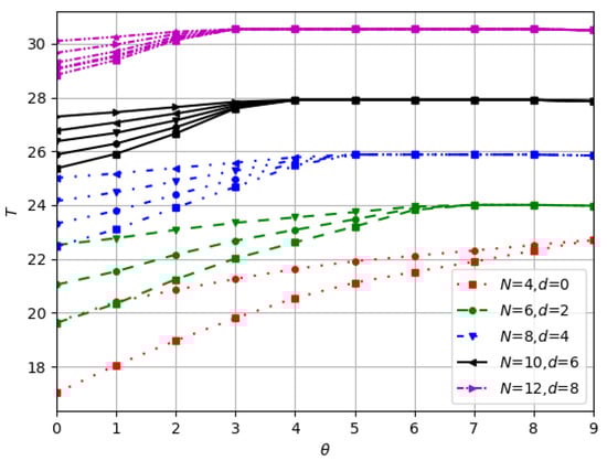 We have conducted an extensive comparative analysis of the given analytical model for various SNR values, transmission lengths N, subcode lengths with time shift d and threshold values . For the experiments in this subsection, we have fixed SNR = 7.0 dB. The maximum transmission time in all the experiments microslots, or 6 ms, so each of the transmission length scenarios may achieve its own maximum number of transmissions . Figure 7 and Figure 8 demonstrate probability of a system being idle and mean spending time for family of curves with various transmission lengths. The legend is consisted of two parameters: N (indicated by color), and d (indicated by marker), respectively, which is defined for a specific curve at the plot. The probability of a system being idle is one of the main characteristics that shows how fast the packet can be transmitted and the system goes back in idle state until the next packet arrives. The higher is the probability, the more efficiently the system copes with the packet transmission. In Figure 7 we can see that the system with the smallest transmission length and fastest feedback exchange shows the best behavior with a slight degradation when increasing d. In general, the given tendency can be visualized for all transmission lengths, which converges to the scenario without e-HARQ prediction (). In Figure 8 we can see the mean time spending of packet measured in microslots. Indeed, smaller transmission lengths encompasses a higher number of possible transmissions in the given time interval, which results in a faster successful delivery process given the quality of the channel. It is interesting to mention that at small SNRs, the systems with transmission length N and outperforms the ones with and maximum d. This tendency fades away with the improvement of network conditions, e.g., at SNR = 10 dB the curves show the similar behavior, however do not intersect.