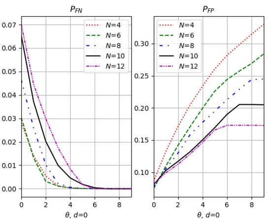 Figure 9 gives us a clear view on prediction errors, such as false negative and false positive ones for . Larger transmission lengths obviously come along with higher FN probabilities in comparison with small N-systems at low values, whereas the false positive probabilities have an opposite behavior with smaller lengths deliveries, characterized by the highest prediction error at bigger . The given performance measures show us the tendencies that we exploit further when finding optimized parameters for e-HARQ prediction.