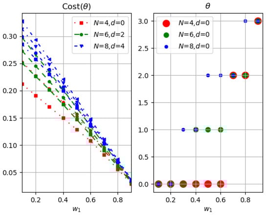 Cost functions for various N (indicated by color), d (indicated by marker): (a) , (b) , (c) , (d) .