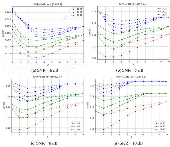 Figure 10 shows dependence between the min cost function and the selected weight factor with a corresponding threshold value from left to right, respectively. It demonstrates in general higher min cost at lower , which can be explained by the fact, that the normalized mean transmission time is significantly larger . So we see a reasonable monotonous decline of the min cost function for a family of curves when incrementing the weight of . This is consistent with expectations in the sense that this decline comes along with the rise of the threshold parameter as shown in Figure 10 (right), which leads to an unfavorable behavior in terms of the main performance measures (Figure 7 and Figure 8). Therefore, given the target network characteristics, the weighted factor can be tuned; and, as can be seen in Figure 11, which shows cost functions with different weights and SNR values, it might be reasonable to take bigger weight value , e.g., in Figure 11a in worse network conditions to combat with higher FN probability. We also visualize a shift of local minimum to the left for lower weight values over a set of SNRs. The cost function in Figure 11d has a strict minimum at due to quite a rapid decline of FN probability to zero, and further shifts the minimum fully to the right at in better network conditions. It is worth mentioning that with the increase of subcode length, the cost function also rises.