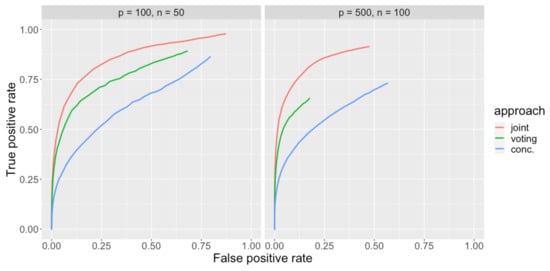The simulation setting for this second experiment is the following. We generated 20 independent runs, each with data sets. We considered two dimensional scenario, with and with . For the concatenation approach, as a first step, we constructed the long matrix and then applied jewel. For the voting approach, we applied the method separately to each data matrix , , and then put an edge in the resulting adjacency matrix only if it was present in 2 out of 3 estimated adjacency matrices. The ROC curves represent each approach’s performance in the left and right panel of Figure 3 for the two-dimensional scenario, respectively.