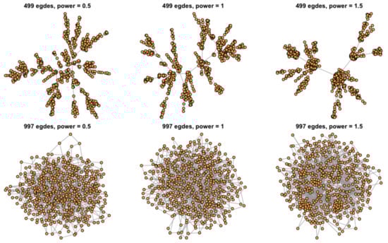 Scale-free graphs with nodes generated with different values of parameters m (in rows) and (in columns). The graphs correspond to one of the 20 random realizations generated in this simulation setup.