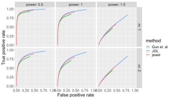 In Figure 5, we show results of this third experiment and observe that on average jewel and JGL are comparable in performance, both being superior to the proposal of Guo et al. This observation remains true even in the worst-case scenario, i.e., . Overall, Figure 5 illustrates the good performance of this class of methods in the sparse regime, although increasing m, the performance decreases (in the worst case, it becomes similar to a random guess for all methods). More specifically, we note that increasing , i.e., hubs size, leads to a significant loss in performance for all the methods. This observation agrees with the recent paper [] for the case of one dataset that explores classical methods, like the one treated in this paper, for inferring a network with big hubs and comes to the same discovery. This observation is quite important since, in many real-world networks, the is often estimated between 2 and 3. We could introduce degree-induced weights into the penalty to overcome this limitation, but this possibility is not explored in this paper.