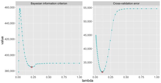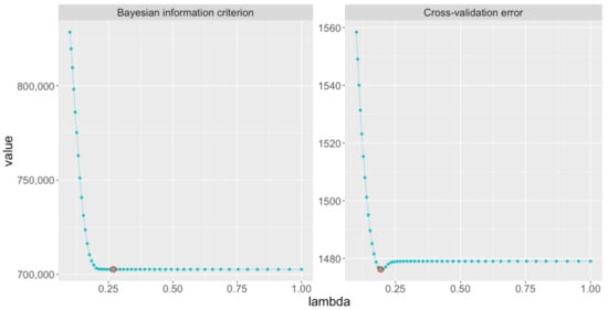 Left panel: values of BIC obtained for glioblastoma datasets with , and , , over the uniform in log-scale grid of 50 parameters of from 0.01 to 1. Right panel: CV error obtained with the same settings. Red circles denote estimated optimal .