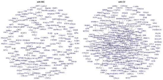 For this illustrative analysis, we limited the attention to the genes belonging to seven pathways from the Kyoto Encyclopedia of Genes and Genomes database [] which were associated with cancer: p53 signaling pathway (hsa04115), glutamatergic synapse (hsa04724), chemokine signaling pathway (hsa04062), PI3K-Akt signaling pathway (hsa04151), glioma pathway (hsa05214), mTOR signaling pathway (hsa04150), and cytokine–cytokine receptor interaction (hsa04060). These pathways involve 920 genes in total; out of them, were present in our datasets. Therefore, we applied jewel on this subset of genes. As described in the previous section, we selected the regularization parameter with both BIC and CV procedures. Finally, we compared the two estimated networks with a network obtained from the STRING database. In the following are the details.