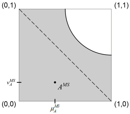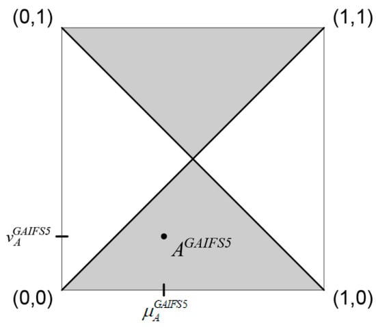 In [39], six different alternations/generalizations of the IFS definition are proposed along with their graphical interpretation. The idea of alternating IFS definition arose since IFS constraint does not seems to be justified in some practical situations and it could be replaced by some other relations [39]. In this paper, the proposed alternations/generalizations are referred to as generalized Atanassov’s intuitionistic fuzzy sets (GAIFS1 to GAIFS6). The definition of one of the presented IFS alternations, GAIFS5, is given below and illustrated in Figure 3.