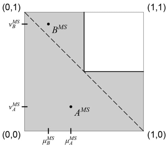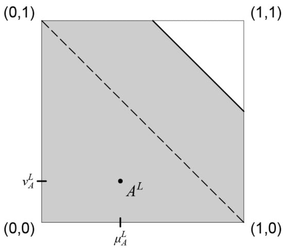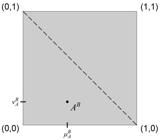 Although this is the most widely accepted IFS graphical interpretation, it does not show values of uncertainty degree unambiguously. Therefore, the other well-known graphical interpretation proposed by Atanassov [2,33] depicts degrees of membership and negation of non-membership, together with the degree of uncertainty between them. This graphical interpretation of IFS, with slight modifications in terms of readability by adding additional inverted axis on right side instead of depicting non-membership as [34], is given in Figure 1b.