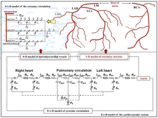 The computational model was adapted from the models developed in our previous studies where the modeling methods and corresponding numerical schemes have been described in detail [10,14]. In brief, a zero-one-dimensional (0-1-D) multi-scale modeling method was employed to represent the coronary circulation coupled to the global cardiovascular system. The 1-D modeling method was used to represent large epicardial coronary arteries and main systemic arteries, while the 0-D (i.e., lumped parameter) modeling method was applied to represent other portions of the cardiovascular system, including intramyocardial vessels, systemic microvasculature, veins, the pulmonary circulation, and the heart (see Figure 1). Coupling the 0-D and 1-D models yielded a closed-loop model capable of describing both coronary and systemic hemodynamics. In particular, the model allowed for incorporation of varying heart rate and coronary artery disease, thereby providing a flexible platform for investigating the characteristics of coronary hemodynamics and myocardial perfusion under various arrhythmic conditions combined with various severities of coronary artery disease. Hereafter, we will give some details on mathematical modeling of hemodynamics in the coronary circulation. The governing equations for hemodynamics in each coronary artery were expressed in the form of 1-D mass and moment conservation equations that describe the time-dependent changes in vascular cross-sectional area (A) and volumetric blood flow rate (Q) along the axis of the artery [10].