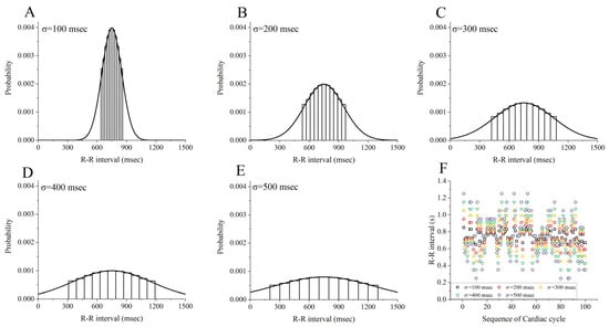 Here, x denotes random cardiac R-R intervals with a mean value of μ (herein set to 750 ms, which corresponds to the baseline HR of 80 bpm), and standard deviation of σ. By changing the value of σ, one can adjust the range of x distribution so as to control the severity of R-R interval irregularity. In this study, the value of σ was varied from 100 ms to 500 ms at an interval of 100 ms to represent the increasing severity of R-R interval irregularity. In addition, in consideration of the fact that all R-R intervals should be physiologically reasonable (e.g., negative R-R intervals are physiologically nonexistent), we only applied Equation (6) to calculate the probabilities of R-R intervals falling in the range of μ − σ and μ + σ. With the constriction, the largest range of R-R intervals was from 250 ms to 1250 ms when σ = 500 ms, which was roughly in line with the range of HRs measured in clinical settings [19]. Panels (A) to (E) of Figure 2 show the probabilities of R-R intervals between μ − σ and μ + σ. In order to generate a sequence of random R-R intervals for 100 cardiac cycles, we first generated 100 R-R intervals based on the probabilities of R-R intervals, and then randomly sequenced them using a random operator embedded in MATLAB. Figure 2F shows the obtained random R-R intervals for 100 cardiac cycles given different values of σ.