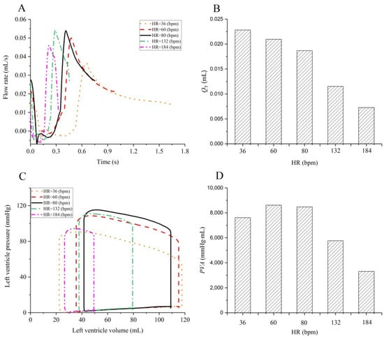 Model-simulated blood flow waveforms (A) and amount of blood flow (QT) (B) in LADb1; and pressure-volume loops (C) and pressure-volume areas (PVA) (D) of the left ventricle under different HR conditions.
