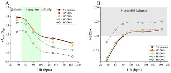 Changes of Qendo/Qepi (A) and MSDBx (B) with variations in HR in the absence or in the presence of coronary artery stenosis of various severities (SR = 20~70%). The region highlighted by shadow in panel (A) represents the range of physiologically normal HR, and the shadowed area in panel (B) denotes the region of myocardial ischemia (i.e., MSDBx > 0).