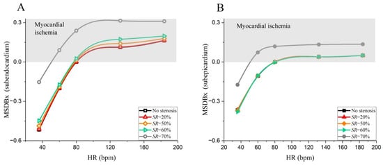 Relationships between MSDBx and HR in the subendocardium (A) and subepicardium (B) in the absence or in the presence of coronary artery stenosis of various severities (SR = 20~70%).