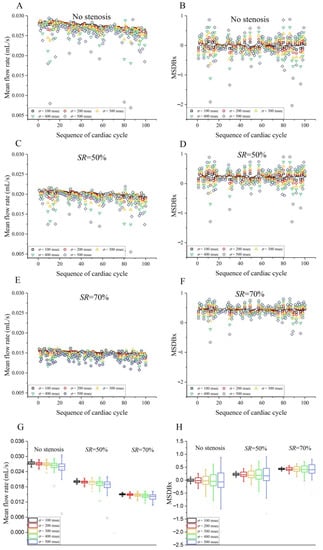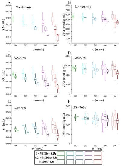 Scatter plots of cardiac cycle-specific mean coronary artery blood flow rates (A,C,E) and MSDBxes (B,D,F) during 100 cardiac cycles with various severities (controlled by the value of σ) of R-R interval irregularity when the coronary artery is normal (no stenosis) or has a 50% or 70% stenosis. The statistical box plots of mean flow rates and MSDBxes computed for each set of 100 cardiac cycles are presented in panels (G,H), respectively.