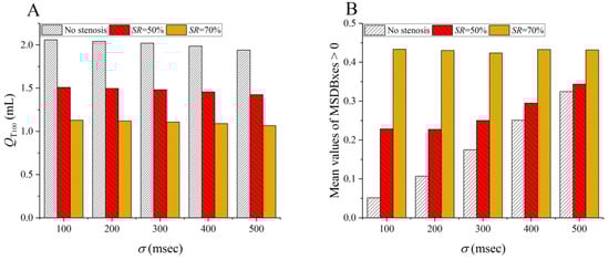 Total amount of blood flow (A) and the mean value of positive MSDBxes (B) during 100 consecutive cardiac cycles with various severities (controlled by the value of σ) of R-R interval irregularity. Herein, the coronary artery is set to be normal (no stenosis), or have a moderate (SR = 50%) or severe (SR = 70%) stenosis.