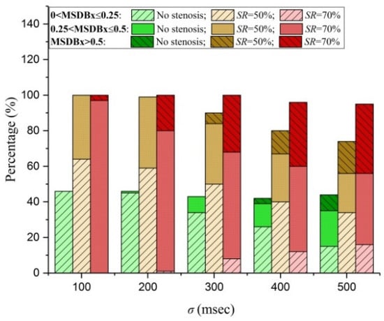 Each set of 100 irregular R-R intervals generated by assigning different values to σ in Equation (6) (shown in panel F of Figure 2) was imposed to the model to simulate the changes in coronary hemodynamics and myocardial perfusion. For the coronary artery (i.e., LADb1), in addition to the normal state (i.e., no stenosis), moderate (SR = 50%) and severe (SR = 70%) stenotic diseases were considered. The cardiac cycle-specific mean coronary blood flow rates and MSDBxes are presented in the form of scatter plots in panels (A)–(F) of Figure 6 and in the form of statistical box plots in panels (G) and (H) of Figure 6. From the scatter plots, it is evident that the stochastic distributions of both mean coronary blood flow rate and MSDBx were enhanced following the increase in σ, which corresponds to the enlargement of the error bars in the box plots. Increasing the severity of coronary artery stenosis led to an overall decrease in blood flow rate, while at the same time an increase in MSDBx. In the meantime, the ranges of stochastic distributions of mean coronary blood flow rate and MSDBx were significantly narrowed when the severity of coronary artery stenosis was high (i.e., SR = 70%). The cardiac cycle-specific mean coronary blood flow rates and MSDBxes were further analyzed over each set of 100 consecutive cardiac cycles to calculate the total amount of blood flow (QT100) and the mean value of MSDBxes larger than zero, with the results being presented in Figure 7 in the form of histograms. It was observed that QT100, as expected, decreased significantly with the increase in the severity of coronary artery stenosis, but only slightly decreased following the increase in σ. In contrast, the mean value of MSDBxes > 0 increased considerably with the increase in σ, with the degree of increase being largest in the absence of coronary artery stenosis, while smallest in the presence of severe coronary artery stenosis. We further performed a stratified data analysis by dividing positive MSDBxes into three groups, i.e., 0 < MSDBx ≤ 0.25, 0.25 < MSDBx ≤ 0.5, and MSDBx > 0.5, which were herein defined to represent mild myocardial ischemia, moderate myocardial ischemia and severe myocardial ischemia, respectively. The grouping of MSDBx allowed us to evaluate the overall risk of myocardial ischemia of certain severity by calculating the percentage of cardiac cycles, with the values of MSDBxes falling in each group among the 100 cardiac cycles. From the results shown in Figure 8, when the coronary artery was free of stenosis, although the total proportion of cardiac cycles with MSDBx > 0 was almost not affected by σ, the proportions of cardiac cycles with 0.25 < MSDBx ≤ 0.5 and MSDBx > 0.5 increased considerably with the increase in σ, indicating that severe irregularity of HRs may result in the occurrence of moderate to severe transient myocardial ischemia even in the absence of coronary artery disease. When there was a moderate or severe coronary artery stenosis (SR = 50% or 70%), the proportion of cardiac cycles with MSDBx > 0.5 increased significantly, although the total proportion of cardiac cycles with MSDBx > 0 and the proportion of cardiac cycles with 0.25 < MSDBx ≤ 0.5 both decreased.