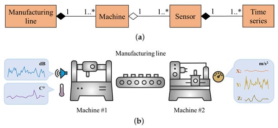 To illustrate the capabilities of TSDBMS, we use the toy subject domain of an Industry 4.0 application, as shown in Figure 1. This example simulates a manufacturing line of metal products, which comprises two machines with sensors installed on them to provide predictive maintenance of the line. The first machine is equipped with a temperature sensor and an acoustic emission sensor to control the heating of the metal and capture waves occurring as a result of changes in its structure (cracks, corrosion, etc.), respectively. Each sensor outputs a single value. On the second machine, a vibration accelerometer is installed to monitor machine vibrations; it outputs three values (vibration acceleration along the X, Y, and Z axes).