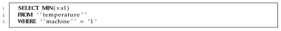 InfluxDB provides the InfluxQL query language with SQL-like syntax. Figure 3 depicts an example of a query that finds the minimum value of the temperature sensor installed on the first machine.