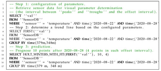 As for mining tools, InfluxQL provides time series prediction through the Holt–Winters method []. Figure 4 shows an example of the prediction of the values of a temperature sensor.