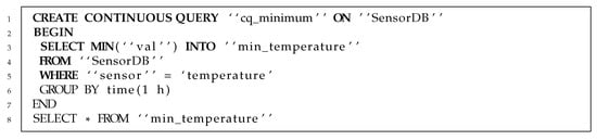 InfluxDB supports continuous queries, which run automatically at a specified frequency. Figure 5 depicts an example of a continuous query that runs hourly and computes the minimum value of temperature sensor readings during an hour.