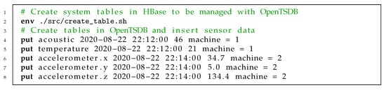Figure 6 gives an example of the creation of a database for the subject domain from Figure 1, where OpenTSDB serves as an add-on over the HBase system. Initially, HBase runs a standard script to create system tables for data storage. Next, a database is created containing five metrics: acoustic, temperature, and accelerometer.x, accelerometer.y, and accelerometer.z, which represent the data from the respective sensors. Each of these metrics has a machine tag to indicate the device the sensor is installed on. The creation of the specified metrics is performed simultaneously with the insertion of data points to the database through the put command since OpenTSDB does not support explicit schema definition. The put command is followed by the metric name, timestamp, data point value, and tags.