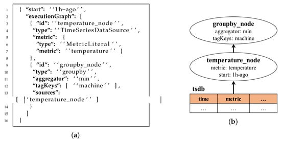 Data retrieval in OpenTSDB. (a) query in JSON, (b) execution graph.