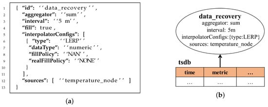 Imputation of missing values in OpenTSDB. (a) query in JSON, (b) execution graph.
