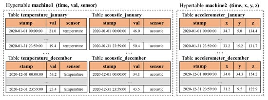 Figure 9 contains s the hypertables of data for the subject domain given in Figure 1. Here, each hypertable stores the time series of sensor data from the corresponding machine. The machine1 hypertable has the following attributes to store data from sensors installed on the first machine: a timestamp, a sensor value, and a sensor type (an acoustic emission sensor or a temperature sensor). The machine2 hypertable defines a way to store the vibration accelerometer data along the X, Y, and Z axes from the sensor installed on the second machine. Both hypertables define a time series split into disjoint subsequences corresponding to periods of one month. Additionally, the machine1 hypertable stores the data from different sensors in separate tables.