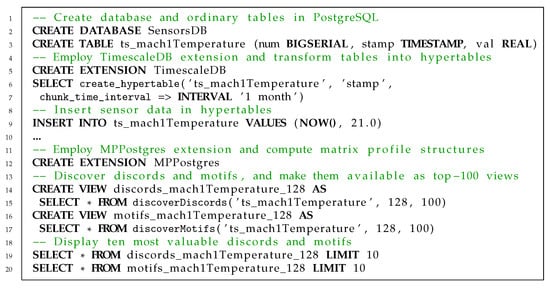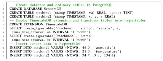 Figure 10 gives an example of the creation of a database in TimescaleDB with the hypertables shown in Figure 9. Initially, a new database and its tables are produced. Next, we employ TimescaleDB as a PostgreSQL extension and convert the tables into hypertables using the system function that specifies the partitioning method. Finally, sensor data are inserted in the hypertables through the regular SQL command INSERT.