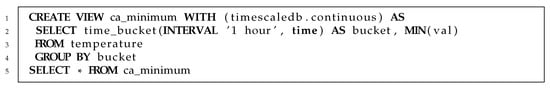 Also, the TimescaleDB supports continuous aggregates, which are views to automatically compute and materialize the results of a specified query in the background. Continuous aggregates are similar to materialized views in PostgreSQL but, unlike the latter, they are updated automatically as data are inserted or modified. Figure 11 provides an example of a continuous aggregate that calculates the average value of temperature sensor data and groups these values in one-hour periods.