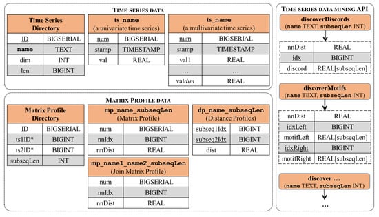 (see DBMS popularity broken down by database model, https://db-engines.com/en/ranking_categories, accessed on 12 April 2021) pointing out that relational DBMSs hold up to 75 percent of the market. By its nature, an RDBMS does not provide built-in data mining functions, whereas the development of in-RDBMS data mining methods is a topical issue []. Indeed, if we consider an RDBMS only as a data repository, this may lead to significant overheads when exporting large data volumes outside the RDBMS, changing data format, and importing the results of the analysis back to RDBMS. In-RDBMS data mining methods cover SQL-based implementations of various problems (for example, association rules [,], clustering [,], graph mining [,], and others) as well as multipurpose libraries and frameworks [,,,]. However, to the best of our knowledge, there are no developments related to in-RDBMS time-series mining.