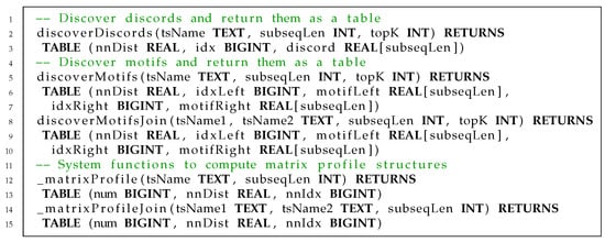 We presented an approach to managing and mining sensor data inside RDBMS based on the Matrix Profile concept []. The Matrix Profile annotates a time series through the index of and the distance to the nearest neighbor of each subsequence of the time series. The Matrix Profile serves as a basis to discover motifs and discords in time series. Sensor data are stored as a set of univariate and multivariate time series tables, and their metadata are provided by the Time Series Directory table. Moreover, the sensor database contains tables to store the Matrix Profile data and the Matrix Profile Directory table to store metadata. We implemented this approach as a PostgreSQL extension which provides an application programmer with a set of user-defined functions (UDFs) to compute a matrix profile and time series data mining primitives and represent them as relational tables.