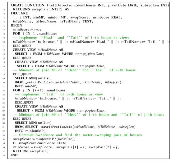In [], the authors exploit the matrix profile concept to detect electricity theft. They simulate a meter-swapping event in a dataset of household electric power demand collected from twenty households [] by swapping the traces of two time series (chosen randomly) starting at a specific date. Next, to discover the swapped pair, they divide each time series into two sections: the “Head”, before the selected date, and the “Tail”, after that date. Finally, among all possible pairs of houses, the resulting pair should have the minimal swap-score, which is computed as