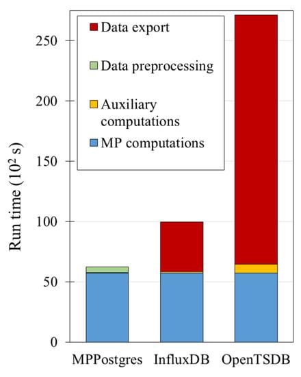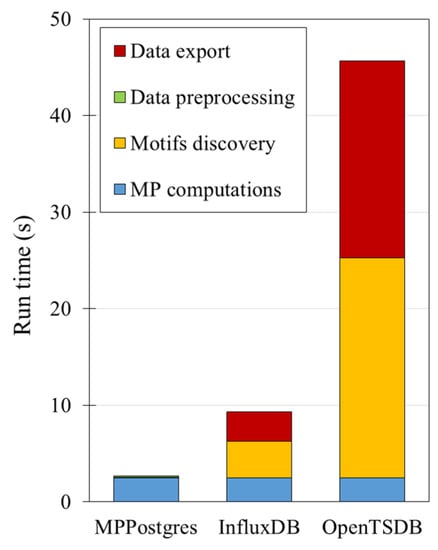 We embedded MP functionality into PostgreSQL v. 13.2 and evaluated the proposed approach in experiments conducted on a workstation (CPU: Intel Xeon Gold 6254 @4 GHz, RAM: 64 Gb, HDD: 1 Tb). In the experiments, we considered three cases of real Industry 4.0 applications related to mining big sensor data and implemented them based on the proposed approach. In these cases, we assumed that sensor data were stored and mined inside PostgreSQL and assessed the performance (running time) of our approach. We also compared our results with those of solutions based on InfluxDB and OpenTSDB, assuming that the sensor data were firstly exported outside these TSDBMSs, then converted to an appropriate format and mined with third-party tools [], and finally, the results were imported back into those TSDBMSs. We keep in mind the fact that out-of-TSDBMS time series data mining is potentially faster than the in-TSDBMS one, but the absence of export-import overhead costs in our approach allows us to hope for an eventual advantage.