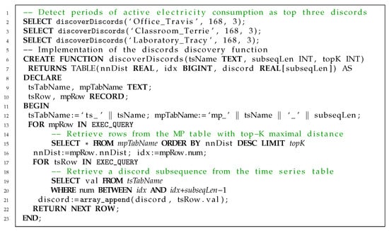 The implementation of the case in MPPostgres is shown in Figure 17. To find the discords, we simply call the function of the TSDM API three times, specifying the respective parameters. The remaining code shows how the above-mentioned function is implemented. The rows of the resulting table are formed through the following loop. Using an SQL query, we select the rows with top-K maximal distance to the nearest neighbor from the MP table and take the values of the index and the distance fields for a row of the resulting table. At last, using the index found, we select all the points of the respective discord subsequence by an SQL query.