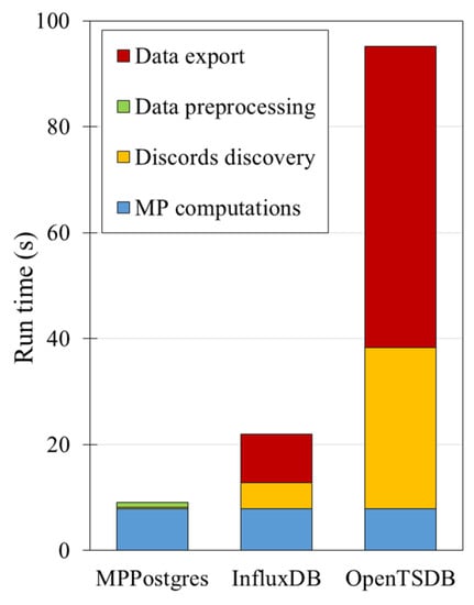 Figure 16 shows experimental results associated with the electricity theft detection case. It can be seen that all the competitors perform matrix profile computations of the same duration. MPPostgres requires a short-time preprocessing for extracting data from tables through SQL queries. Also, all the solutions perform auxiliary computations (finding the minimum, computing , etc.), where MPPostgres is slightly ahead of rivals. Finally, data export (extraction of data and its transference to a third-party application) introduces significant overheads due to out-of-TSDBMS solutions and is absent in our approach.