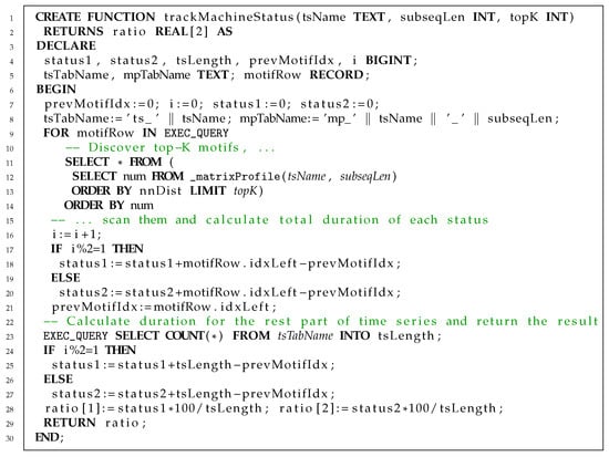 The implementation of the described case in MPPostgres is shown in Figure 19. After computing the matrix profile of an input time series, we use an SQL query to retrieve top-K motifs as rows of the MP table with top-K minimal distance to the nearest neighbor of the respective subsequence. Then, we scan the time series from left to right through the indices of motifs found while computing the length of the interval between the previous and current motif and alternately adding the result to a total duration that indicates when the machine works in the first or the second mode. Finally, after similar one-time computations over the remaining part of the input time series, we obtain the resulting ratio.